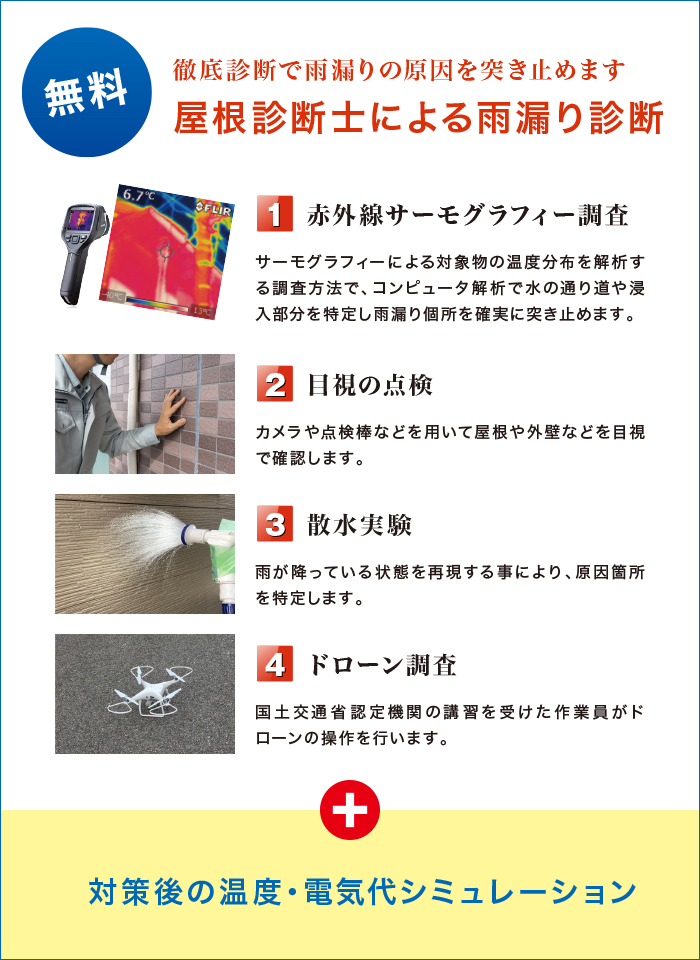 当社では、マンション・アパートの屋根診断に精通したエキスパートが、赤外線サーモグラフィーや目視点検、ドローン調査、散水実験などを組み合わせた徹底診断を実施し、雨漏りの原因を的確に特定します。調査後は、対策前後の温度変化や電気代への影響シミュレーションも無料でご提供。