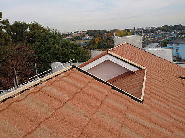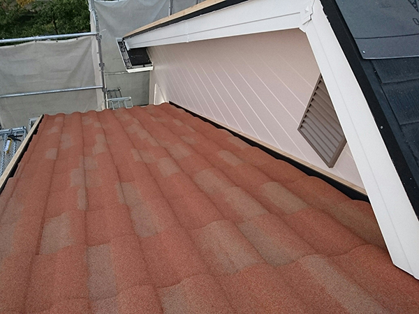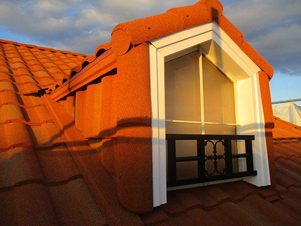 屋根材として使用させて頂いたローマンは、ジンカリウム鋼板に自然石を吹き付けコーティングした製品で、粘土を素焼きしたスペイン産の色鮮やかな瓦のような印象ですが、重さは瓦1m2約50kgに対し、ローマンは1m2約6kgと非常に軽量でいて、30年間保証メンテナンスフリーという優れた製品です。