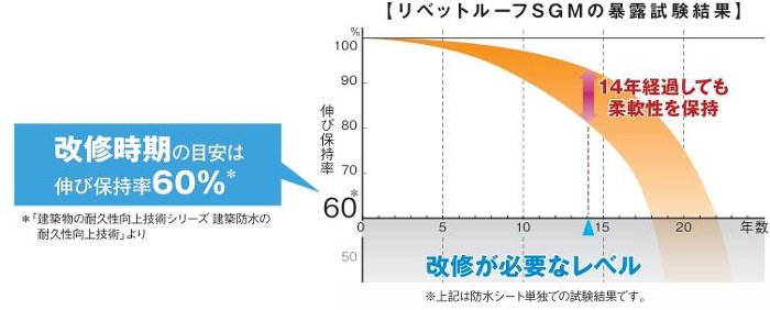 実暴露試験により、新品と14年経過したリベットルーフを比較した結果、多少の劣化は見られるものの、防水性能に必要な柔軟性はしっかり維持されていることが確認されています。さらに、防水シート自体が高い耐候性を備えているため、定期的なトップコートの塗り替えが不要なのも特長です。ウレタン防水