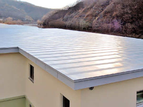 エコラミは、熱可塑性ポリオレフィン(TPO)フィルムを、溶融亜鉛―5%アルミニウム合金めっき鋼板にラミネート加工した、耐久性に優れた鋼板です。TPOフィルムは、耐候性や曲げ加工性、耐薬品性、耐酸性に優れており、過酷な環境でも安定した性能を発揮します。JFE鋼板