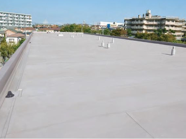 ウレタン塗膜防水は、現場で塗布・硬化させるため下地になじみやすく、優れた密着性を発揮します。標準仕様では端末の押え金物が不要で、クッション性にも優れ、歩行にも適しています。さらに、継ぎ目のないシームレスな防水層を形成するため、継ぎ目から雨水が浸入する心配がありません。