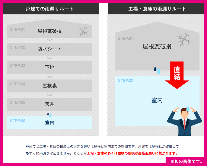 工場であればそこで稼働してる機械類が雨にさらされるリスクがあり、倉庫であれば保管物が雨で濡れてしまうリスクがあります。