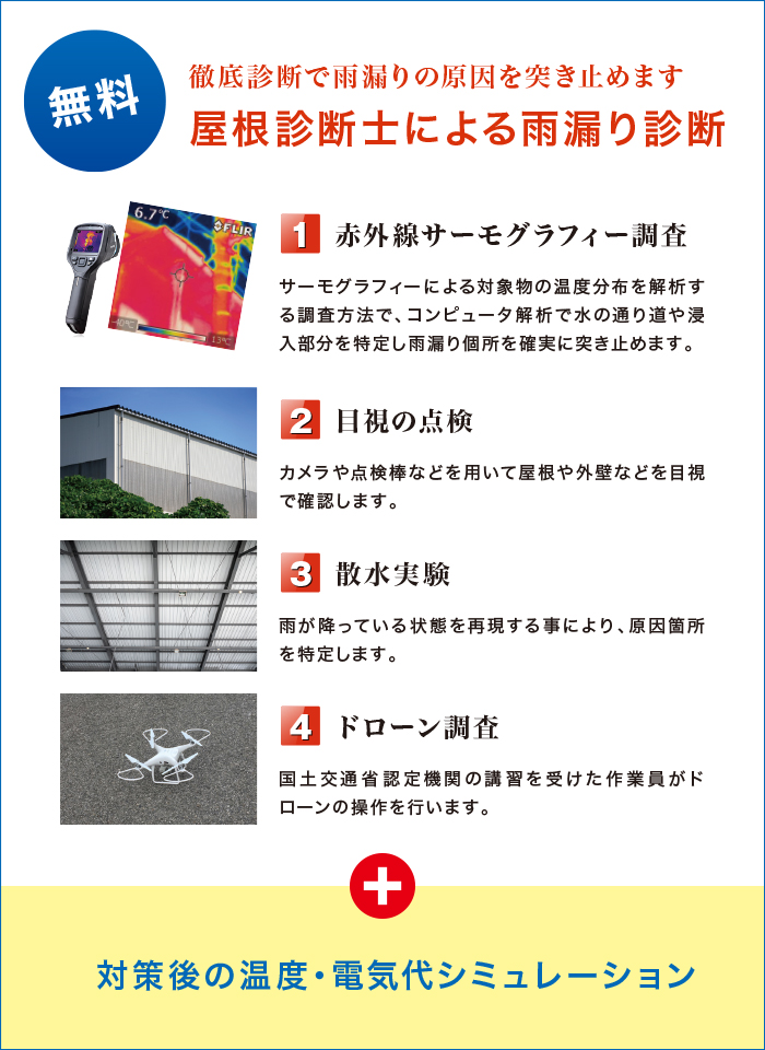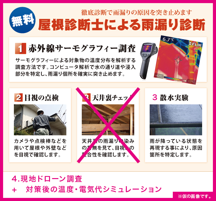 当社では屋根診断のエキスパートが、赤外線サーモグラフィー、目視の点検、ドローン調査、散水実験などの徹底診断で雨漏りの原因を突き止めます。